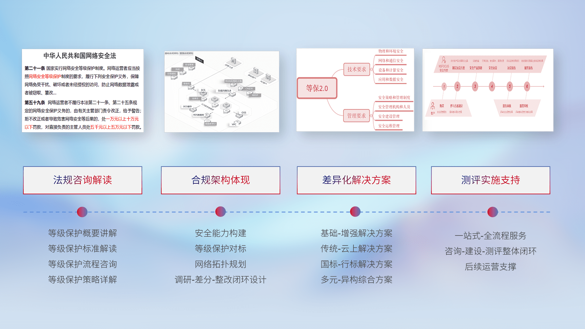 通过专业的法律咨询解读、、、、合规架构体现、、差异化解决方案、、、、测试实施支持等服务,,,为客户量身打造等保合规体系。。。。